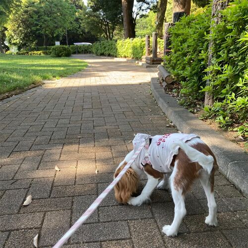 東京の散歩道。 GWで人が少なく歩きやすかったです。 緑の中の散歩は空気が気持ちよいですね。 もっちゃんも楽しそうに歩きます。 都会ぶってお洋服を着せていましたが、 あれ?? 意外とみんな着てない!!笑 みっちゃんの時は、 お洋服着てる子ばっかりだ…